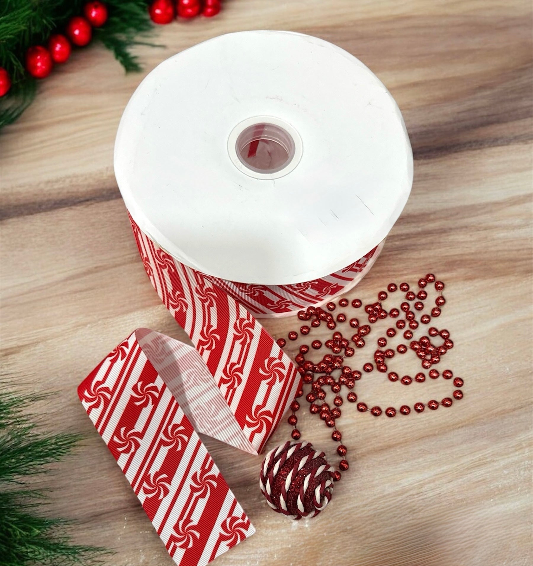 Cinta faya de frutos de navidad (muérdago) de 3.8CM. El precio es por metro.