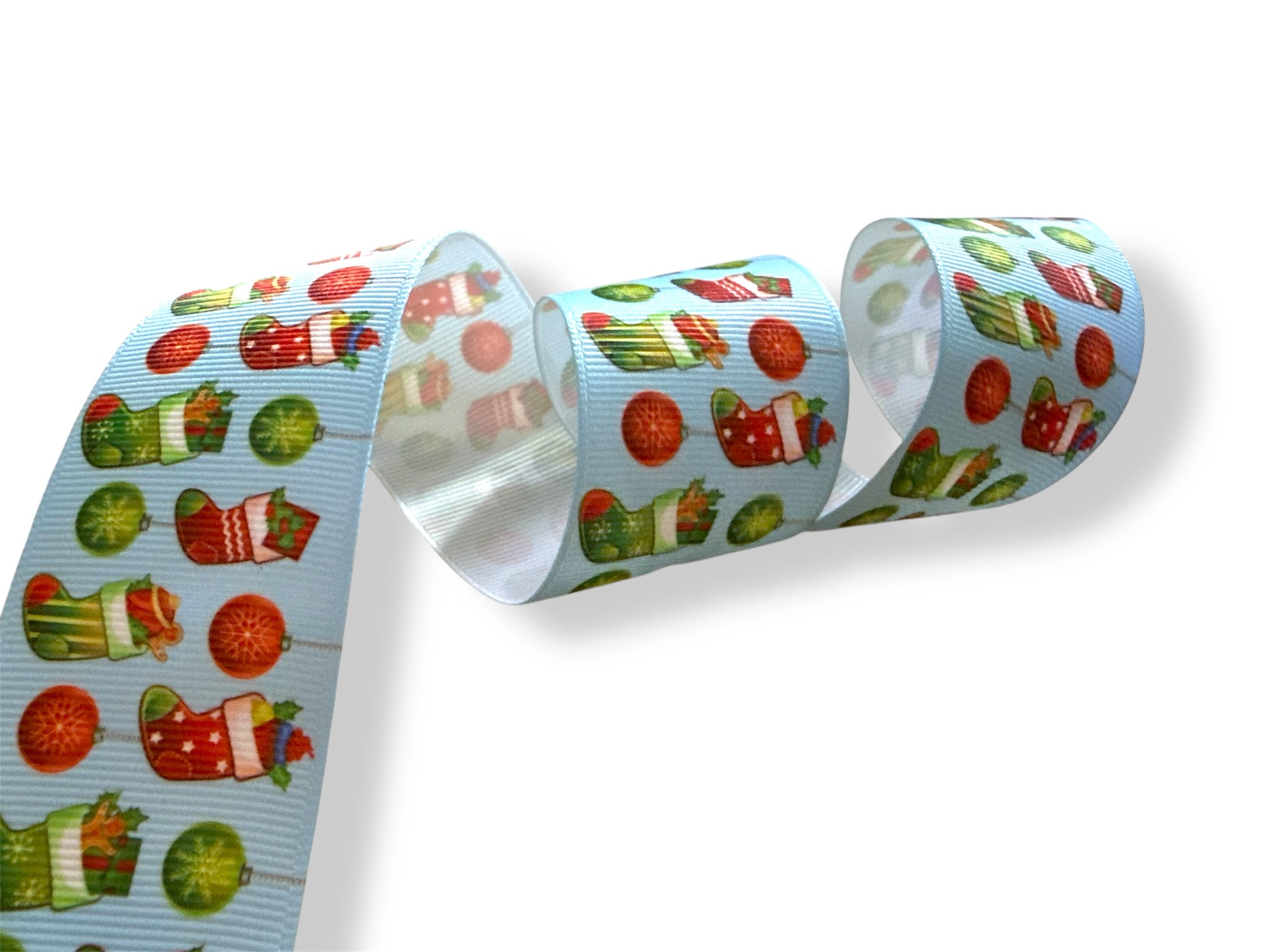 Cinta de raso con estampado de navidad calidad nacional. El precio es por metro.